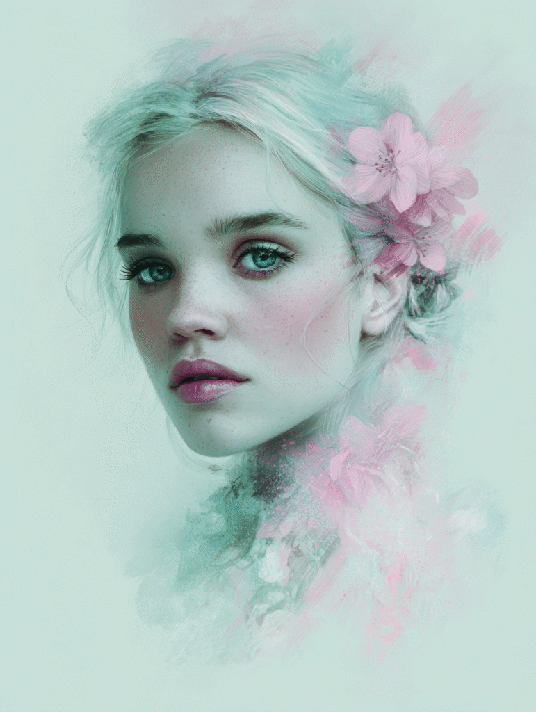 •🌸 a portrait of a woman, pastel pink and mint green tones → dreamy & soft