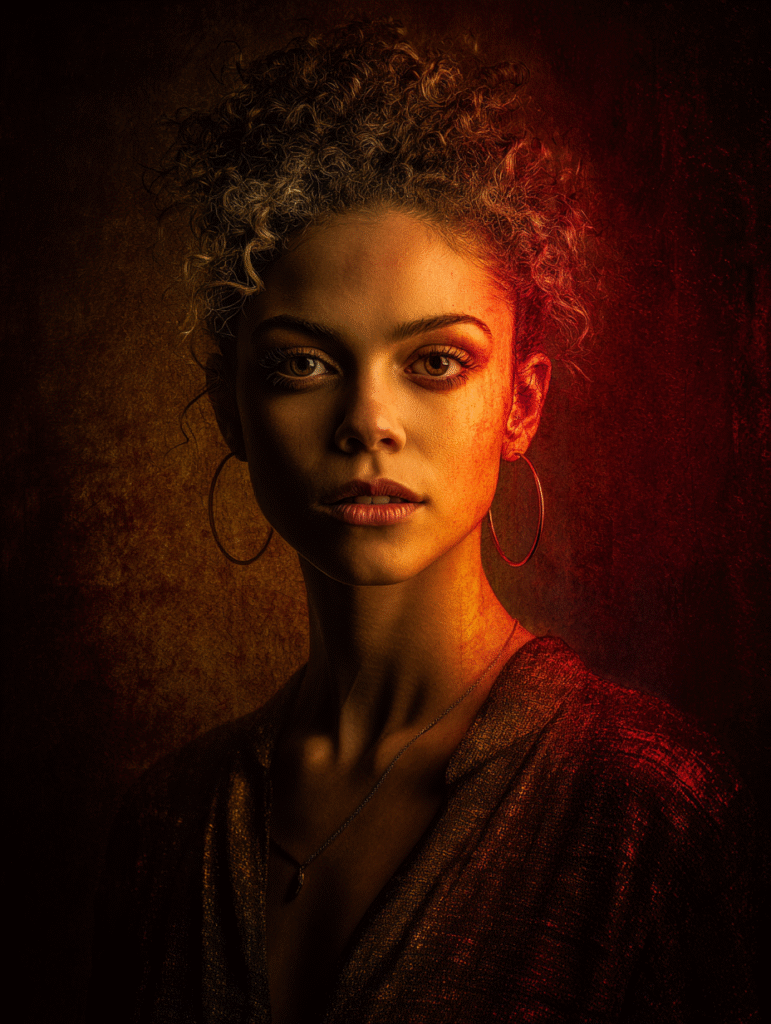 •🔥 a portrait of a woman, red and gold lighting → dramatic & powerful