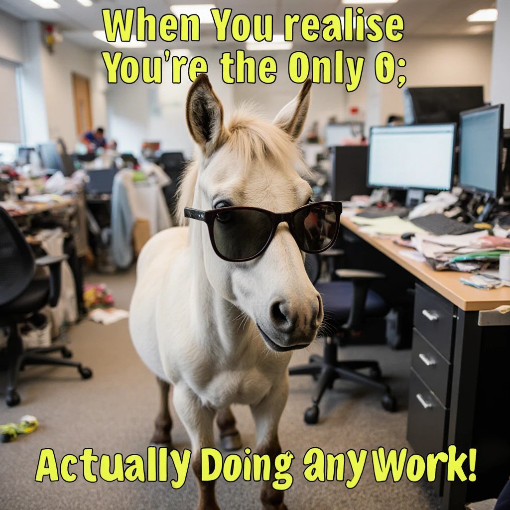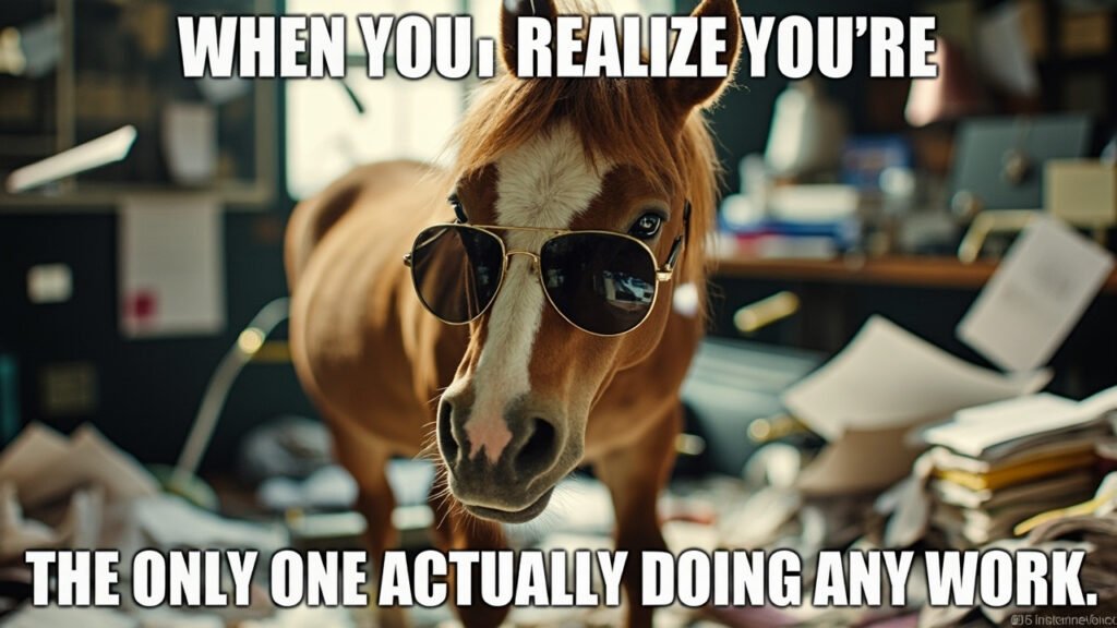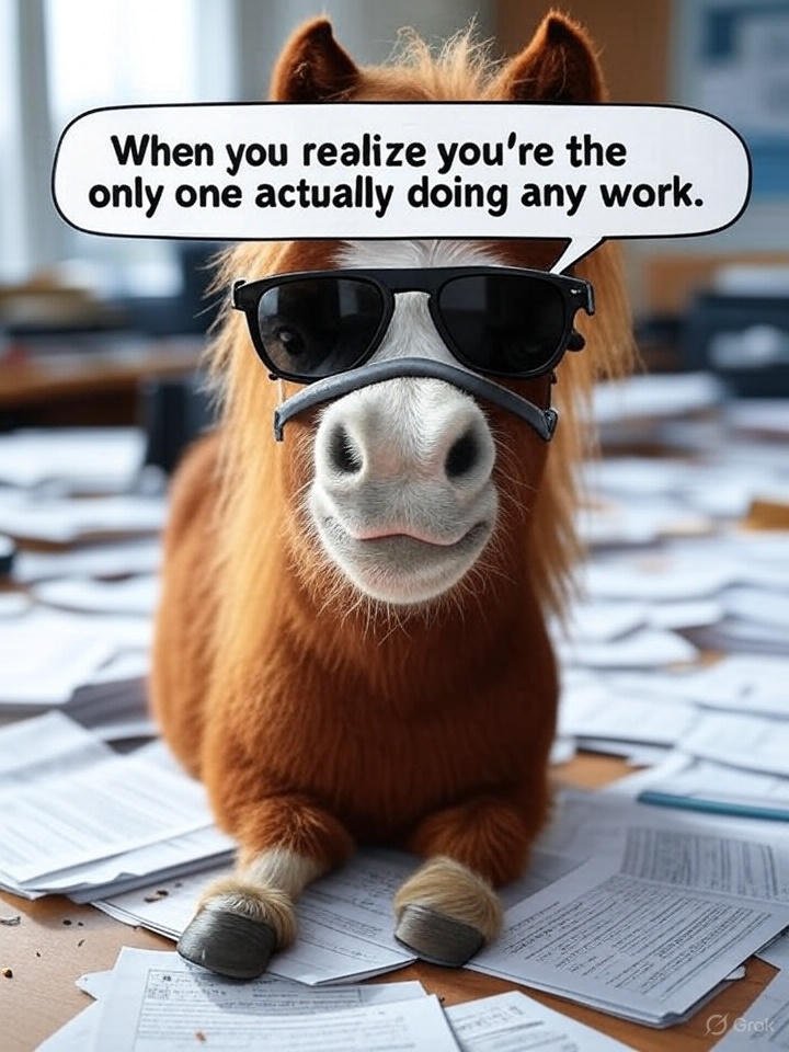 Prompt: “a grumpy miniature horse wearing sunglasses, standing in a chaotic office, with meme text: “When you realize you’re the only one actually doing any work”